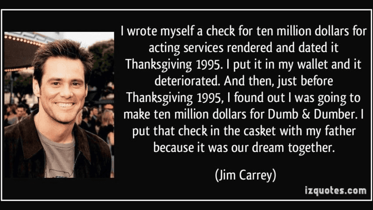 १९९२ च्या सुमारास कॅरीने स्वतःला १० दशलक्ष डॉलर्सचा चेक लिहिण्याचा निर्णय घेतला. त्याने तीन वर्षे नंतरची, थँक्सगिव्हिंग डे ची तारीख घालून "अभिनय सेवेसाठी प्रस्तुत" असं लिहून तो चेक स्वतःला दिला. कॅरीने स्मरणपत्र म्हणून हा चेक त्याच्या पाकिटात सुरक्षित ठेवला होता. तीन वर्षे उलटली आणि थँक्सगिव्हिंग डे ला बॉक्स ऑफिसवर हिट झालेल्या "डंब ॲंड डंबर" या चित्रपटासाठी त्याला १० दशलक्ष डॉलर्स मिळाले. हा अत्यंत संस्मरणीय क्षण कॅरीच्या कारकिर्दीतील टर्निंग पॉइंट ठरला. जेव्हा कॅरीच्या वडिलांचे निधन झाले, तेव्हा कॅरीने आपल्या वडिलांच्या शवपेटीमध्ये १० दशलक्ष डॉलर्सचा स्वतःला लिहिलेला चेक त्यांना श्रद्धांजली म्हणून ठेवला.
