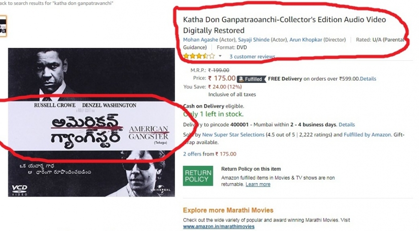 ‘कथा दोन गणपतरावांची’ या दिलीप प्रभावळकर आणि मोहन आगाशे अभिनित चित्रपटाला ‘अमेरिकन गँगस्टर’ या चित्रपटाच्या चक्क तेलगु डब व्हर्जनचा फोटो चिकटवलाय. हि मात्र हद्दच झाली राव. या अमेझॉनवाल्यांना आपलं मराठी कल्चर कळतं की नाय ? कळत नसेल तर कधी पुण्यात ये म्हणावं. तेही जमत नसेल तर गुगल करा ना राव ! एवढं सिम्पल असतंय तरी हे लोक लहान मुलांसारख्या चुका करतात. असो.
