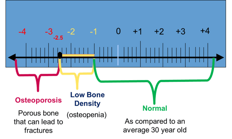 -२.५ किंवा त्यापेक्षा कमी टी-स्कोअर म्हणजे ऑस्टियोपोरोसिस.