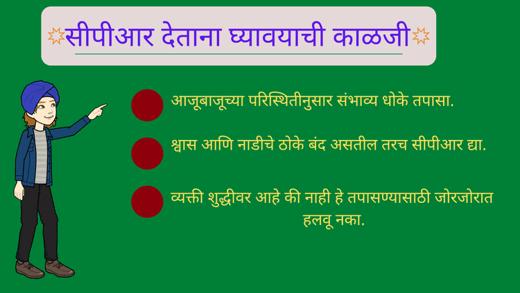 २. व्यक्तिला हृदयविकाराचा झटका आल्यानंतर तिचा श्वास, नाडीचे ठोके इ. चालू आहेत का हे पाहावं लागतं. जर ते बंद असतील तरच सीपीआरचा वापर करायचा असतो. भानावर असलेल्या किंवा श्वास घेऊ शकत असलेल्या व्यक्तीला सीपीआर देणं धोक्याचं ठरू शकतं.