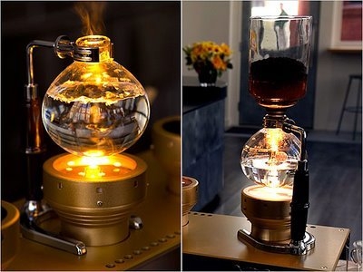या प्रकारांमध्ये एकावर एक अशी दोन काचेची भांडी रचलेली असतात. यामध्ये कॉफी मुख्यतः वाफेचा दाब आणि गुरुत्वाकर्षण यांच्यामुळे तयार करता येते. या खालच्या भांड्यातील पाणी उकळून त्याची वाफ आणि हवा वरच्या भांड्यातील कॉफीच्या पावडरमध्ये मिसळली जाते. खालच्या भांड्याला उष्णता देणे बंद झाले की वाफ तयार व्हायची थांबते आणि खालच्या भांड्यात एक निर्वात पोकळी म्हणजेच व्याक्युम तयार होते हातावरच्या भांड्यातील हवेचा दाब जास्त होतो आणि त्यामुळे दाबातील फरकामुळे त्या भांड्यातील कॉफीचा द्राव खालच्या भांड्यात खेचला जातो. या कॉफी-मेकरला सिफन कॉफी मेकर असे ही म्हटले जाते. याचा वापर आजकाल बहुधा हॉट कॉकटेल्स व ब्रॉथ बनवण्यासाठी होतो.