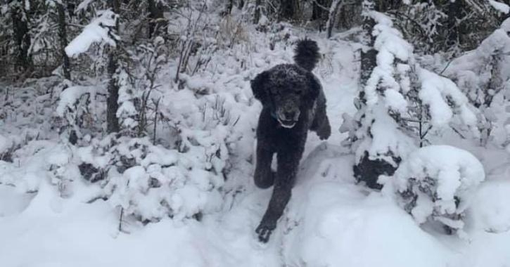 या फोटोत पहिल्यांदा पाहिलेत तर बर्फाळ डोंगरात बॅकपॅक घातलेला एक माणूस पळताना दिसतोय. पण काही सेकंद निरखून पाहिलंत तर एक काळा कुत्रा बर्फातून पळत येताना दिसतो.