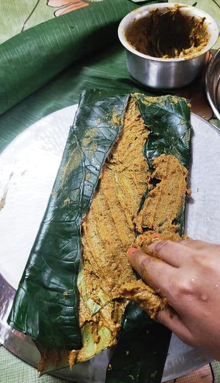 २. लाकडी पाटावर किंवा परातीला उपडे करून स्वच्छ पुसून त्यावर अळूचे मोठे पान पाठच्या बाजूने पसरा.