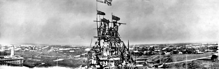 हा उद्घाटनप्रसंगी काढलेला फोटो आहे. फोटोत एक लाकडी मचाण दिसत आहे. मचाणावर उभ्या असलेल्या माणसांनीच या इमारती बनवण्यासाठी घाम गळला होता. ते ब्रिटनचा युनियन जॅक फडकवताना दिसत आहेत.