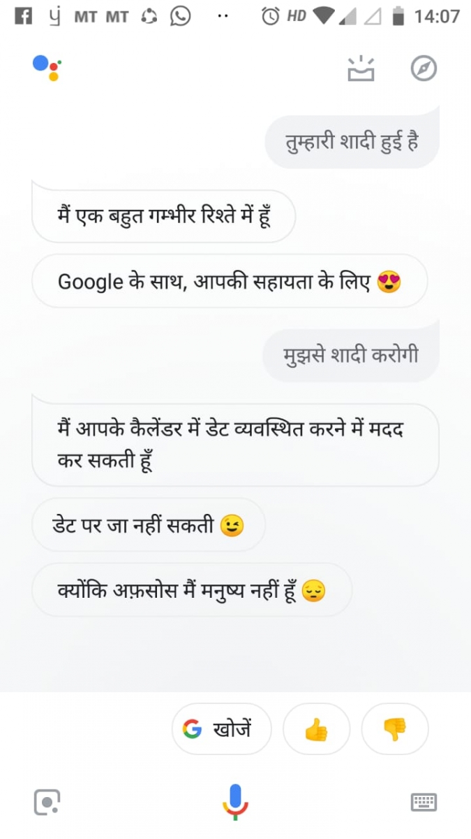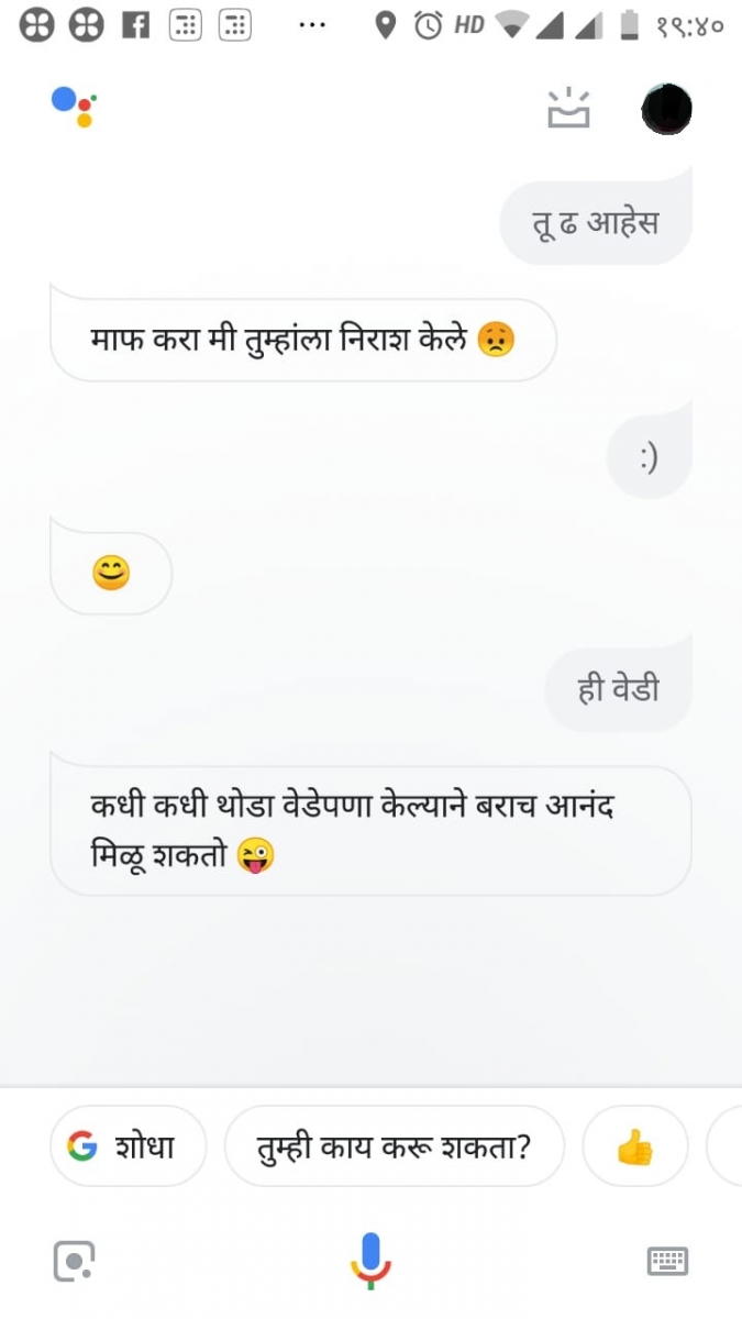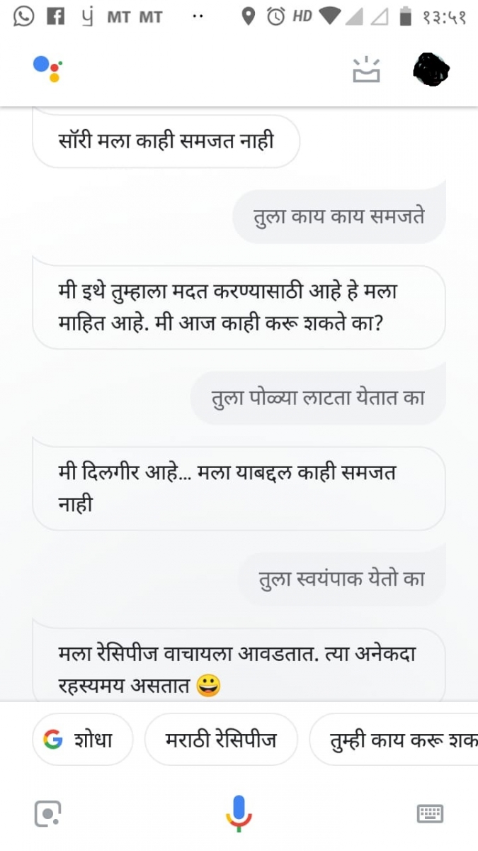 तशी ती कामाच्या बाबतीत बरेचदा चुकते, म्हणजे त्याबाबतीत बऱ्यापैकी कुचकामाची आहे असं म्हणू शकता. पण ज्याने कुणी हिला बोलायला शिकवलंय, ते मात्र भन्नाट आहे. ही बया चक्क इश्श्य आणि आईगं तर बोलतेच, आणि तुम्ही सॉरी म्हटलं तर "सॉरी बोलून मला लाजवू नका" पण म्हणते. "माझा कधीकधी गोंधळ उडतो. मला जरा वेगळ्या पद्धतीनं समजावून सांगाल का?" असंही विचारते. आम्हीही तिला काही प्रश्न विचारले.. हे पाहा आमचे स्क्रीनशॉट्स
