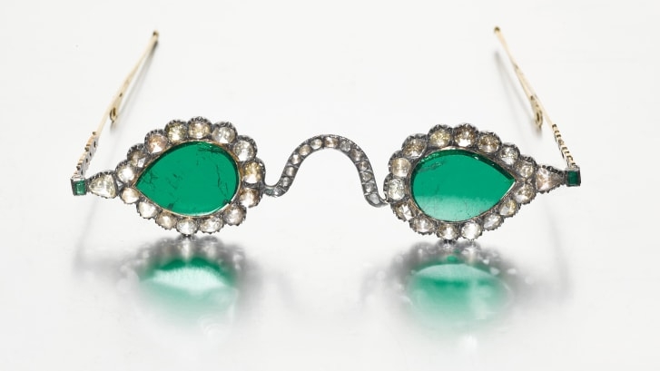 मुघल राजघराण्यातील हिरे आणि पाचूजडीत असलेल्या चष्म्यांच्या दोन जोड्या आहेत. हे चष्मे निरखून पाहिले तर त्यात इतकी मनमोहक कलाकुसर आहे की कोणीही थक्क होऊन जाईल. हे चष्मे १७ व्या शतकातील आहेत असे मानले जाते. त्या चष्म्यांच्या लेन्समध्ये ही दुर्मिळ सुंदर रत्ने वापरली गेली आहेत. ती आकाराने लेन्सच्या आकारापेक्षा कमी आहेत. एका चष्म्याच्या लेन्समध्ये भारतीय हिरे जडले गेले आहेत. ते "हॅलो ऑफ लाईट" लेन्स आहेत. हे हिरे २०० कॅरेटच्या हिऱ्यातून घेतले गेले होते. त्यावेळी हे हिरे गोवळकोंड्यामध्ये म्हणजे सध्याच्या आंध्र प्रदेश आणि तेलंगणा या प्रदेशात ते सापडले होते. त्याकाळी अशुभ गोष्टींपासून दूर राहण्यासाठी या अश्या वस्तू बनवल्या जात. या वस्तू शुभदायक ठरतात, तसेच हे परिधान करणाऱ्यांना ज्ञानप्राप्तीसाठी मदत करतात असे मानले जायचे.