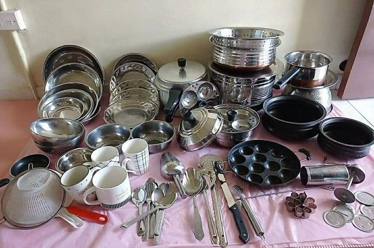 हे झालं भांड्यांच्या मटेरियलबद्दल. आता पदार्थ साठवण्यासाठी आणि अन्न शिजवण्यासाठी किती आणि कोणती भांडी असावीत हे बघू. यासाठी घरात चार माणसं आहेत असं गृहीत धरून त्यानुसार अंदाज दिलेला आहे.