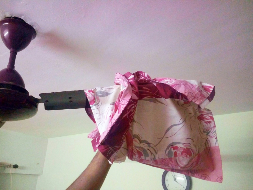 हे सगळं टाळायचं तर पंखे साफ न करून पण चालत नाही. मग आम्हांला मिळाला इंटरनेटवर कमीत कमी वेळात आणि धूळ न सांडता पंखे चकाचक करण्याचा एक उपाय. आज तोच आम्ही आमच्या वाचकांसाठी घेऊन आलो आहोत. करायचं काय, तर एक जुना उशीचा अभ्रा म्हणजेच पिलो कव्हर घ्यायचं आणि त्याची पंख्याच्या पात्याला मस्तपैकी टोपी घालायची. मग पंख्याच्या बुडापासून टोकापर्यंत उशीच्या कव्हरने हळूहळू पातं पुसायचं. यात होतं काय, पंख्यावर कितीही धूळ साचली असली, तरी ती सगळी त्या उशीच्या खोळीत जाऊन पडते. या पद्धतीत एक पातं साफ करायला अर्धं मिनिट पुरतं. कोरडी धूळ उशीच्या खोळीत जमा झाली आणि  ओल्या कापडानं एकदा सगळी पाती पुसून घेतली की काम खल्लास!! मग ती खोळ उलटी करून कचर्‍याच्या डब्यात झटकून चांगली धुऊन घेतली तर पुढच्या वेळेसही पुन्हा कामाला येईल.