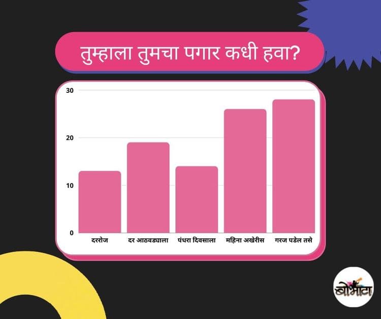 भारतात महिना संपला की पगार मिळतो,अमेरिकेसारख्या देशात काही आस्थापनांमध्ये प्रत्येक आठवड्यात पगार देण्याची पण व्यवस्था असते.तुम्हाला काय आवडेल ? सर्वेक्षणात मिळालेली उत्तरे वेगवेगळी आहेत पण महिन्याच्या शेवटी पगार मिळावा असे म्हणणार्यांची संख्या जास्त आहे.