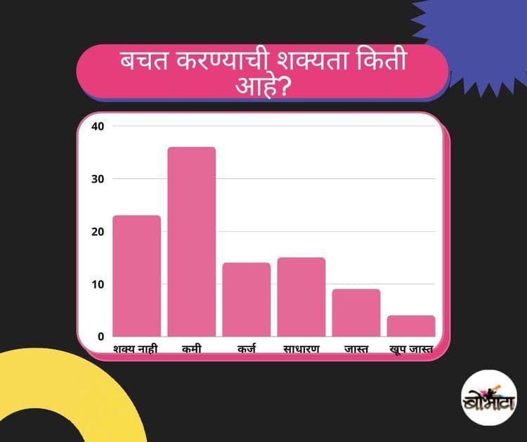 आता खरं सांगायचं तर 'बोभाटा'नेच असा सर्व्हे काही महिन्यांपूर्वी केला होता.आता या दोन्ही सर्वेक्षणात काय उत्तरं मिळाली ती तुमच्यासमोर ठेवतो आहेच. आमच्या सर्वेक्षणात मात्र हे प्रमाण इतके मोठे आढळलेले नाही. तरीपण बर्याचजणांना महिनाभर पैसे पुरत नाहीत ही सत्यस्थिती आहे.खर्चाचा अंदाज येत नाही.नियोजन करता येत नाही.अचानक संकटे उभी राहतात.अनेक वेगवेगळी कारणे समोर येतात.आमचे सर्वेक्षण काय सांगते ते आता बघा ! सोबत या प्रश्नांची उत्तरं तुम्ही कमेंट्मध्ये दिलीत तर सर्वेक्षणाला अधिक मान्यता मिळेल.