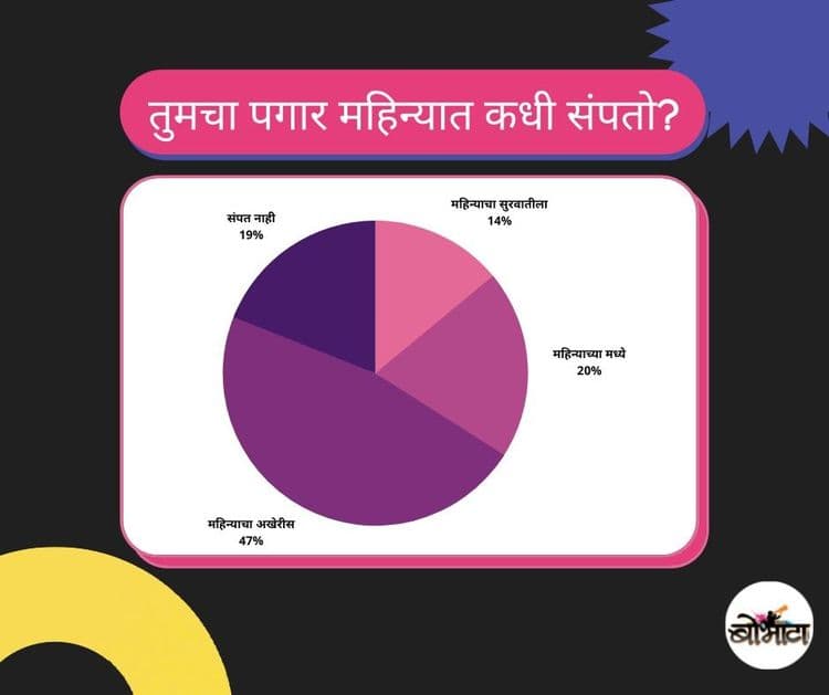 महिना संपायच्या आधीच पगाराची रक्कम संपते का ? आमच्या सर्वेक्षणात १४% लोकांचे पैसे महिन्याच्या सुरुवातीलाच संपतात तर ४७% लोकांचे पैसे महिनाअखेरीस संपतात.तुमचे बजेट किती दिवस चालते ?