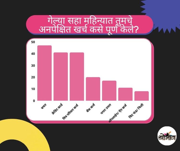अचानक खर्च उभा राहिला तर ? आम्हाला मिळालेल्या उत्तरातून बर्याचजणांची बचत अचानक खर्चात संपून जाते.बर्याचजणांना क्रेडीटकार्डचा आधार असतो. मित्र आणि परिवाराकडून उसने पैसे घेणे हा पर्याय ४०%च्या आसपास आहे.