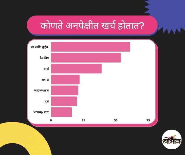 अनपेक्षीत खर्चाच्या सर्वेक्षणात आढळले ते असे की घर-कुटुंब आणि वैद्यकीय समस्या यामुळे जास्तीतजास्त लोकांचे पैसे खर्च झालेत.यापैकी वैद्यकीय समस्या निवारणासाठी कितीजणांकडे विम्याचे संरक्षण आहे या प्रश्नाचे नकारार्थी उत्तरच जास्त मिळाले.