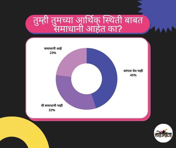 आर्थिक स्थितीबद्दल किती लोक समाधानी आहे ? या प्रश्नाचे उत्तर देताना 'नक्की सांगता येणार नाहि' हे उत्तर देणार्यांची संख्या जास्त होती. फक्त २३% लोक आहे त्या स्थितीत समाधानी असल्याचे आढळले.