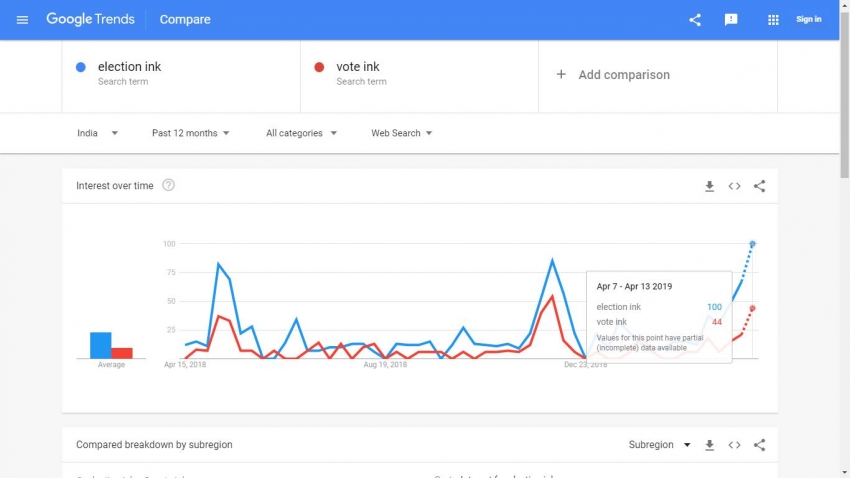 मंडळी, बोभाटाने यावर थोडी शोधाशोध करून माहिती मिळवली आहे. ती अशी की, काल उत्तर प्रदेशच्या काही मतदान केंद्रांवर बोटावरची शाई सहज पुसली जाण्याची घटना घडली होती. निवडणूक आयोगाकडे तशी तक्रार पण करण्यात आली होती. याच बातमीच्या निमित्ताने मतदानाची शाई सर्वाधिक सर्च करण्यात आली असावी असा एक अंदाज आहे. याखेरीज मतदानाची शाई निदान आठवडाभर तरी बोटावर राहते. ती निघत कशी नाही या कुतूहलापोटी पण लोकांनी सर्च केल्याचं आपण समजू शकतो. यात आघाडीवर आहेत ते दक्षिणेतील राज्य. याचं करण म्हणजे पहिल्या टप्प्यात आंध्र आणि तेलंगणा भागात मतदान झालं आहे.