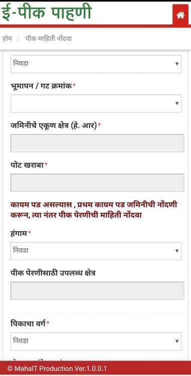 सुरुवातीला परिचय या पर्यायावर क्लिक करा. तिथे वैयक्तिक माहिती भरावी. मग होम या बटनावर क्लिक करून मागे यावे, तिथे पिकांची माहिती असे असेल तिथे क्लिक करा. तिथे तुम्हाला अनेक पर्याय दिसतील. जसे गट क्रमांक, हा पर्याय निवडला की पुढे तुमच्या नावावर असलेले क्षेत्र आणि पेरणीसाठी उपलब्ध क्षेत्र आपोआप येते तिथे काही टाकण्याची गरज नाही.