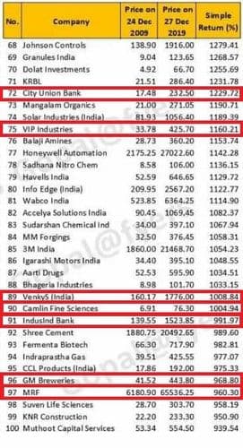 या १०० समभागाच्या यादीत पहिला समभाग आहे अवंती फीड्स नावाच्या कंपनीचा! २००९ साली या कंपनीचे समभाग रु. १.६७ या किंमतीत उपलब्ध होते. समजा, तुम्ही तेव्हा १००० समभाग घेतले असते तर एकूण गुंतवणूक झाली असती रुपये १६७०! दहा वर्षे ही गुंतवणूक तशीच ठेवली असती तर आताच्या घडीस तुमच्या हातात ५,७८,७५० रुपये जमा असते . याच यादीत शेवटचा समभाग आहे मूथूट कॅपिटल या कंपनीचा! हे समभाग घेतले असते तरी मुद्दल दहापट झाले असते ! पण मग सगळ्या गुंतवणूकदारांचा असाच फायदा का होत नाही? हा प्रश्न मनात येणे साहजीकच आहे.