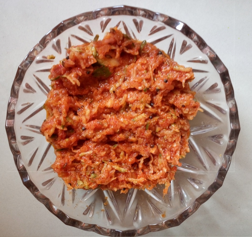 २. या किसलेल्या मिश्रणात चवीप्रमाणं मीठ, साखर/बारीक चिरलेला गूळ आणि लाल तिखट घाला आणि नीट कालवून घ्या.