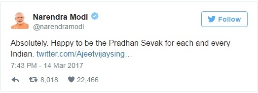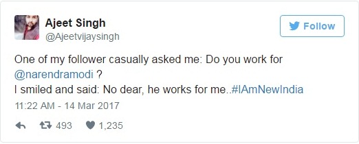 अजित सिंह या व्यक्तीनं नरेंद्र मोदींना उद्देशून एक ट्विट केलं. अश्या साध्या ट्विटला मोदी कशाला बघतील? पण मोदींनी लगेचच यावर आपली प्रतिक्रिया दिली. हे ट्विट असे होते कि “मला एकाने विचारले कि तू नरेंद्र मोदीसाठी काम करतो का ? यावर मी हसून म्हणालो कि मी त्यांच्यासाठी नाही उलट ते माझ्यासाठी काम करतात”!!