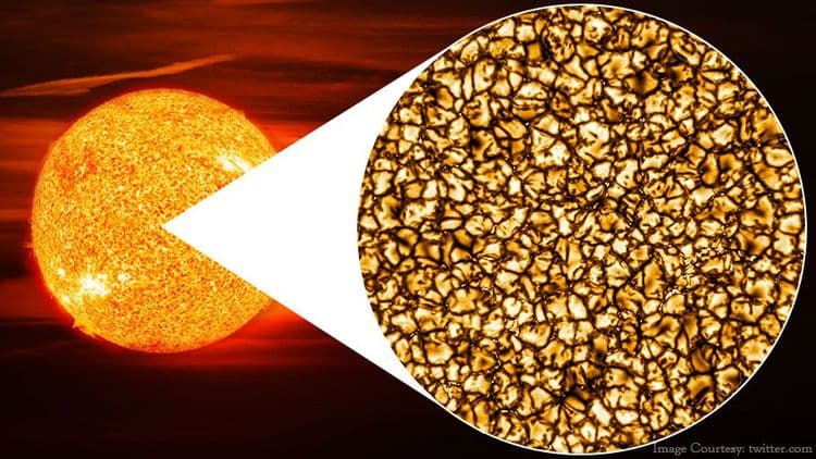 हा फोटो डॅनियल के. इनोये सोलार टेलीस्कोपने तब्बल ९.३ कोटी मैल लांबून टिपलेला आहे. ज्या आकृत्या आपण पाहत आहात त्या खरं तर कप्पे आहेत. अशाच कप्प्यांनी मिळून सूर्य बनलेला आहे. सूर्याच्या अंतर्गत भागात निर्माण होणाऱ्या प्रचंड उष्णतेमुळे हे कप्पे तयार होतात. आतील उष्ण प्लाज्मा बाहेर येऊन थंड होतो आणि पुन्हा आत जातो. या प्रक्रियेमुळे गडद रंगाच्या रेषा तयार होतात. फोटोमधले हे लहानसे कप्पे महाराष्ट्राच्या दुप्पट मोठ्या आकाराचे असतात.