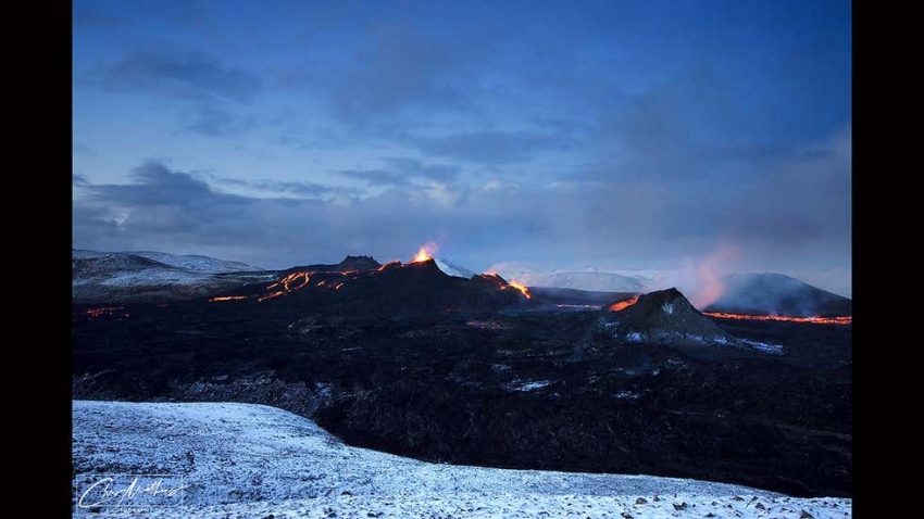 आइसलँडमध्ये ज्वालामुखीचे उद्रेक अनेकवेळा होतात. ५ रिष्टरपेक्षा मोठ्या तीव्रतेचे भूकंप होत असल्याने ज्वालामुखीचे उद्रेक होत असतात. मॅथ्यूजने आइसलँडमधील गेल्डिंगडालूर ज्वालामुखीच्या उद्रेकाचे सर्व रंग अगदी खुबीने फोटोत कैद केले आहे. मॅथ्यूजने १९ मार्च २१ ला संध्याकाळी ग्रिंडावॅक शहराच्या जवळ हा ज्वालामुखीचा विस्फोट झाला. मॅथ्यूजने २० मार्चच्या पहाटे,अचूक वेळ साधत हे फोटो घेतले. फोटोमध्ये वाहत्या लाव्हाची चमक ज्वालामुखीच्या वरील ढगांमध्येही दिसून येते. हा अनुभव खूप रोमांचक होता असे मॅथ्यूज सांगतो.