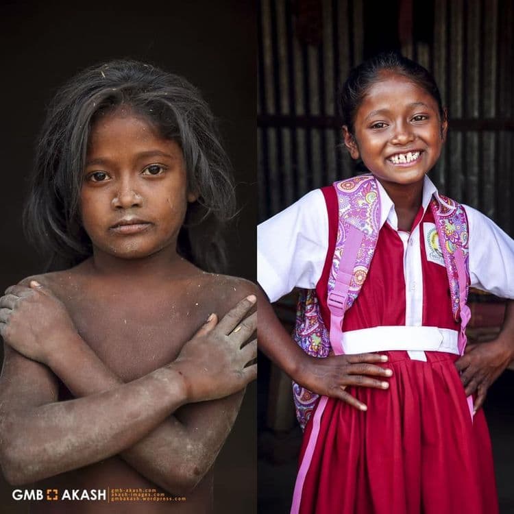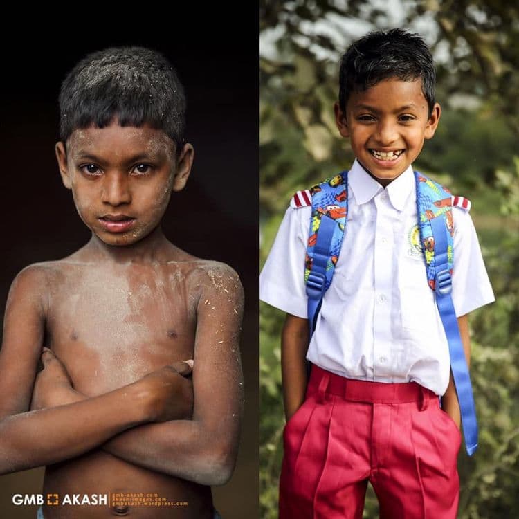 शिक्षण हा मुलांचा मुलभूत हक्क आहे. प्रत्येक मुलाला शिक्षण हे मिळालंच पाहिजे, पण काही मुलांना शिकण्याच्या वयातच मजुरी करावी लागते. दोन वेळच्या अन्नाची चिंता नसलेल्या वयात त्यांना काम केलं तरच दोन वेळचं अन्न मिळणार असतं. या मुलांना शिक्षण मिळावं म्हणून अनेक संस्था, समाजसेवक काम करत असतात. बांगलादेशमधल्या GMB Akash नावाच्या फोटोग्राफारने देखील बालमजुरांना शाळेत पाठवण्याची मोहीम हाती घेतली आहे. तो मुलांच्या आईवडिलांची परवानगी घेऊन जमेल तेवढ्या मुला-मुलींना शाळेत पाठवण्याचं काम करतो. फोटोग्राफर असल्याने त्याने मुलांचं शाळेत जाण्यापूर्वीचं आणि नंतरचं रूप कॅमेऱ्यात टिपलंय.