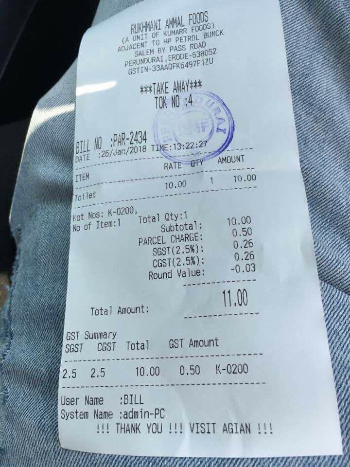 तर झालं असं की, एक माणूस तामिळनाडू च्या एका हॉटेलमध्ये गेला असता तिथे त्याने टॉयलेटचा वापर केला. तो बाहेर आल्यानंतर हॉटेल वाल्यांनी त्याच्या हातात पद्धतशीरपणे बिल टेकवलं. सहसा टॉयलेटच्या बाहेर पैसे घेतले जाऊ शकतात. पण या माणसाच्या बाबतीत जे घडलं ते कदाचित कोणाबरोबरही घडलं नसेल. या माणसाला त्याच्या टॉयलेट वापरण्यावर बिल तर मिळालंच, पण बिलााातत चक्क ‘जीएसटी’ चार्ज करण्यात आला होता. एकूण हिशोब असा होता :