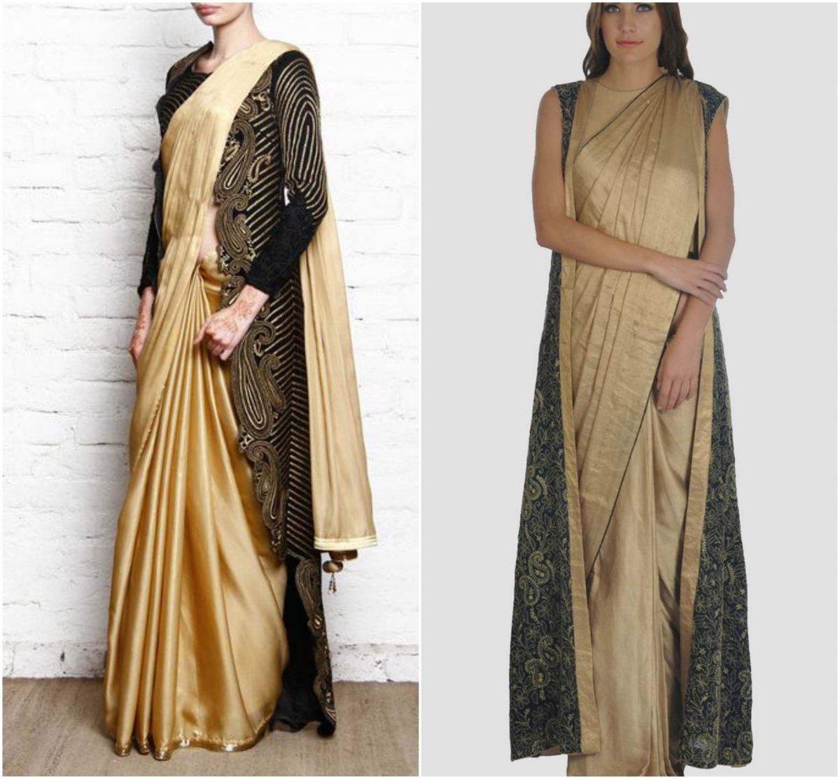 आता जॅकेट ब्लाऊजच्याच लांबीचं हवं असा काही नियम आहे का? आम्हांला वाटलं तर अगदी फ्लोअर लेन्ग्थ जॅकेट घालूनसुद्धा साडीचं सौंदर्य आम्ही खुलवू शकतो असंच म्हणायचंय ना या दोघींना? योगायोगानं दोघींनीही बेज किंवा सोनेरी छटांमधल्या साड्या नेसून त्याला विरूद्ध रंगाच्या जॅकेटची जोड दिलीय. तुम्ही कोणत्याही रंगाच्या प्लेन साडीसोबत कॉंट्रास्ट रंगातलं जॅकेट वापरू शकता. नंतर हेच जॅकेटस ऍंकल लेन्ग्थ ट्राऊझर्स आणि टीशर्टसोबत घालून मिक्स & मॅचही करू शकालच.