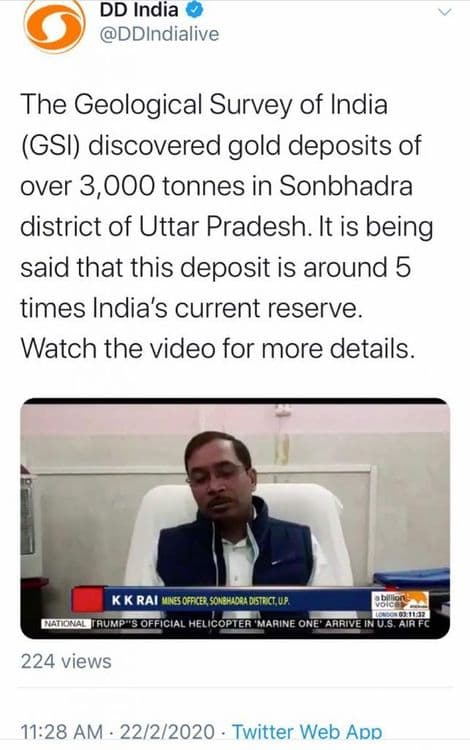 खोटी बातमी सर्वात आधी पोस्टकार्ड न्यूज वेबसाईटच्या महेश विक्रम हेगडे यांनी दिली. या माहितीत म्हटलं होतं की ‘सोनभद्रमध्ये ३३५० टन सोनं सापडलं आहे. हे सर्वच्या सर्व सोनं भारतीय तिजोरीत दाखल होईल.’