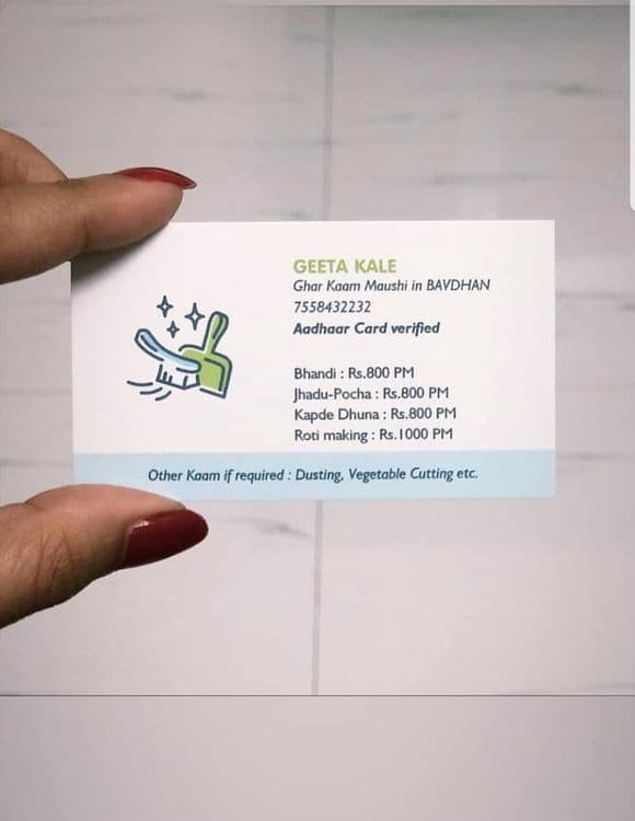 बावधनमधील गीता काळे या धनश्री शिंदे यांच्याकडे घरकाम करायला जातात. त्या सतत चिंतेत असायच्या की कामे कशी मिळवायची, धनश्री शिंदे यांनी त्यांना सहज म्हणून एक आयडीया सांगितली आणि त्या एका रात्रीत फेमस झाल्या. ती आयडीया होती व्हिजिटिंग कार्ड तयार करण्याची. धनश्री शिंदे यांनी गीता मावशीला सगळी माहिती विचारून घेतली आणि त्यानुसार व्हिजिटिंग कार्ड तयार करून घेतले. आणि आजूबाजूच्या सोसायटीमधील वॉचमनला देऊन आल्या, जेणेकरुन वॉचमन ते कार्ड इतर लोकांना देतील. धनश्री शिंदे आणि गीतामावशीला पण आजूबाजूचे लोक बघतील आणि आपल्याला काम मिळेल एवढीच अपेक्षा होती. पण ते कार्ड वाऱ्यासारखे सोशल मीडियावर पसरले.