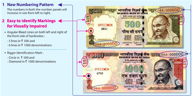 तर मंडळी या रेघा आहेत दृष्टीहीनांसाठी. त्या ब्रेल लिपीत आहेत. पाचशे च्या नोटेवर 2-1-2 अश्या तर 1000 च्या नोटेवर 1-2-2-1 च्या पॅटर्न मध्ये रेघा आहेत. नुसतं हाताळून सुद्धा आता नोटेची किंमत ओळखणे शक्य झाले आहे.