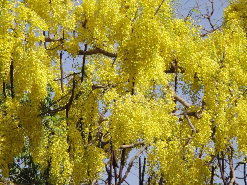 इंदिरा संतांनी या बहाव्याच्या फुलोर्याला ’सोनतोरण’ हे नांव बहाल केलंय. शिशिरातल्या पानगळतीमुळे जवळजवळ निष्पर्ण झाड आणि पिवळ्याधम्मक फुलांचे घोस. त्यांच्या प्रेमात पडल्याशिवाय राहावत नाही.