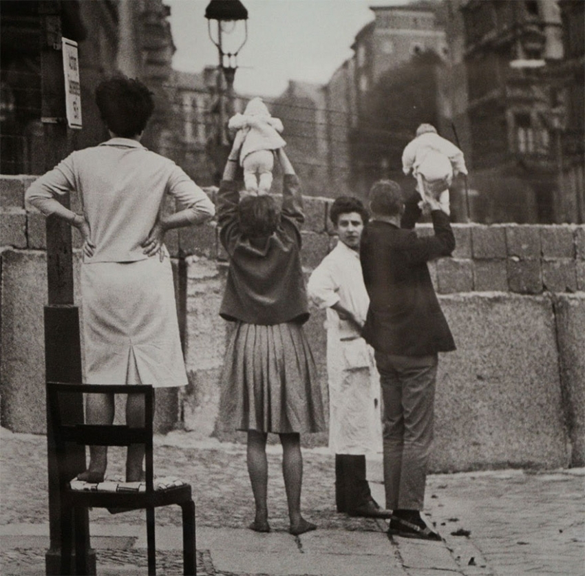 १०. १९६१, पश्चिम बर्लिनमधील नागरिक पूर्व जर्मनीतील आपल्या आईवडिलांना मुलाचा चेहरा दाखवताना.