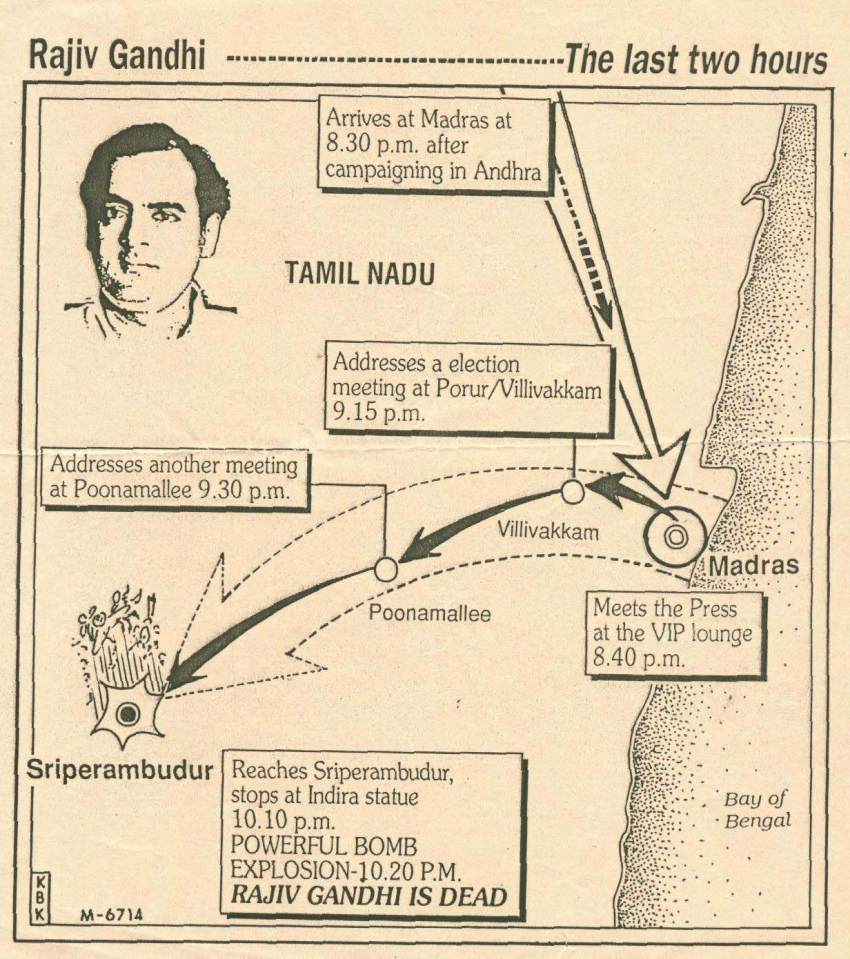 तामिळनाडूतल्या इंदिरा काँग्रेस पक्षात तेव्हा दुफळी माजली होती. राममूर्ती गटाला अखिल भारतीय अण्णा द्रविड मुन्नेत्र कळघम (अण्णा द्रमुक) या जयललितांच्या पक्षाशी युती हवी होती; तर मूपनार गटाचा अशा आघाडीला कडाडून विरोध. मात्र निवडणुका आल्यानं दोन्ही गटांनी तात्पुरती शस्त्रं म्यान केली होती आणि एकीचा आभास निर्माण केला होता, इतकंच. तामिळनाडूत काँग्रेसनं सत्तेचं सुख अनुभवलं, त्याला आता २५ वर्षं उलटली होती. अण्णा द्रमुकचे सर्वेसर्वा आणि जयललितांचे मार्गदर्शक एम. जी. रामचंद्रन यांच्या निधनानंतर राज्यात स्वतंत्रपणे पाय रोवण्याचे प्रयत्न काँग्रेसनं १९८८-८९ च्या एका निवडणुकीत केले होते; पण तेव्हा पक्षाचा धुव्वा उडाला होता. आता अण्णा द्रमुकशी आघाडी आणि राजीव गांधींचा दौरा यांच्यामुळं स्थिती सुधारेल, अशी आशा वाटू लागली होती; तरी आपली आघाडी जिंकणारच असल्यानं राजीव गांधी राज्यात प्रचाराला नाही आले, तरी चालेल, असंच राममूर्तीना वाटत होतं.