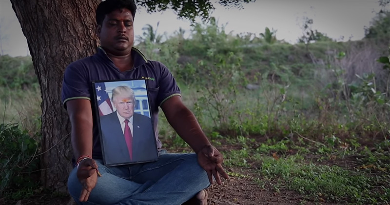 या मानसाचं नाव हाय ‘बुसा कृष्णा’. मुक्कामपोस्ट जनगाव, तेलंगणा. ‘बुसा कृष्णा’ एक सामान्य शेतकरी हाय. त्यानं आपल्या देव्हाऱ्यात ट्रम्प तात्यांचा फोटो ठेवलाय. त्यानं तर फोटोला दुधाने अभिषेकपण केला. हे सगळं ट्रम्प तात्यांना खुश करण्यासाठी.
