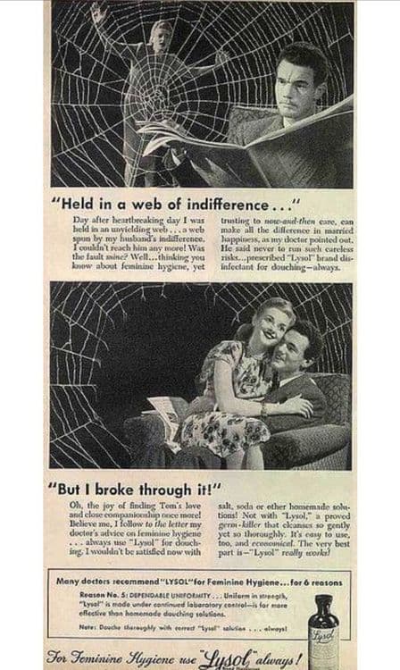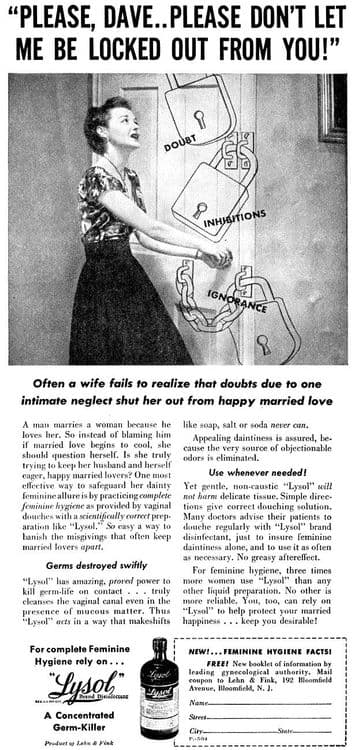 स्पॅनिश फ्ल्यूची साथ ओसरल्यावर लेन अँड फिंक कंपनीने जाहिरातीची दिशा बदलली. लायझॉल हे स्त्रियांच्या आरोग्यासाठी उपयुक्त औषध म्हणून प्रसिध्दीस आणले. स्त्रियांच्या योनीमार्गातील जंतूसंसर्ग कमी करण्यासाठी हा एक अभिनव मार्ग असे सुचवणाऱ्या अनेक जाहिराती तयार करण्यात आल्या. सोबत दिलेला नमुनाच पाहा!!