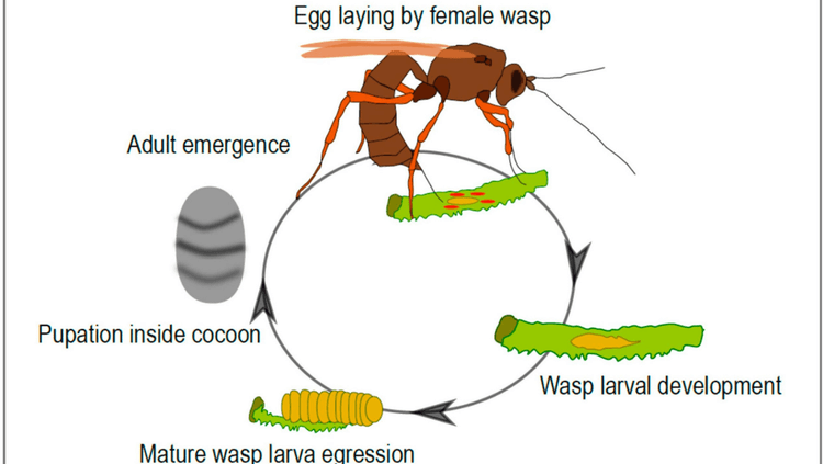 अंड्यातून बाहेर पडलेली अळी हळूहळू त्या किटकाच्या शरीरात प्रवेश करते आणि आतमधल्या फ्लुईड्स आणि अवयवांना अशा पद्धतीने खाते की तिला कोषात जाईस्तोवर पुरेसे पोषण मिळेल व किटक जिवंत राहील. किटकाचे फुफ्फुसं, हृदय आणि मेंदू हे सर्वात शेवटी खाल्लं जातं. संशोधकांचा असा अंदाज आहे की अळी किटकाच्या अंतर्भागात विशिष्ट द्रव्य पसरवते, ज्यामुळे बॅक्टेरियल इन्फेक्शन न होता किटकाची जखम ताजी राहते.