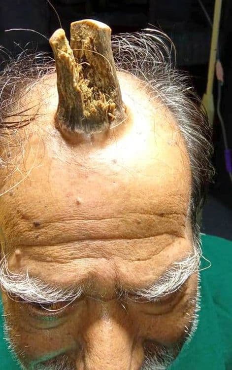 मंडळी, ही बातमी पण खरी आहे आणि तो शेतकरी पण. मध्यप्रदेशमध्ये राहणाऱ्या श्यामलाल यादव या ७४ वर्षांच्या आजोबांच्या डोक्यावर हे शिंग उगवलं होतं. फोटोत दिसत असल्याप्रमाणे हे शिंग वाटत असलं तरी ते खरोखरचं शिंग नाही.