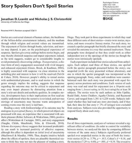 २०११ साली सायकोलॉजिकल सायन्स या मासिकाने एक शोधनिबंध प्रसिद्ध केला होता. या शोधनिबंधाचं नावंच होतं ‘story spoilers don't spoil stories’. शुद्ध मराठीत ‘स्पॉइलरने तुमच्या आनंदाचा सत्यानाश होत नाही नाही.’
