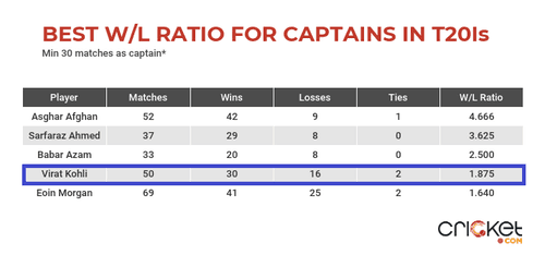 कमीत कमी ३० सामने खेळलेल्या कर्णधारांमध्ये तो विजय-पराजय गुणोत्तरात चौथा सर्वोत्तम कर्णधार आहे. त्याने ५० पैकी ३२ सामने जिंकले आहेत आणि फक्त 1१६ गमावले आहेत. त्यानुसार विराटचे विजय-पराजय गुणोत्तर २.० आहे. या यादीत त्याच्या पुढे असगर अफगाण, सरफराज अहमद आणि बाबर आझम आहेत. जगातील सर्वोत्तम कर्णधारांमध्ये विराट चौथ्या क्रमांकावर आहे. या यादीत तो एकमेव भारतीय कर्णधार आहे.